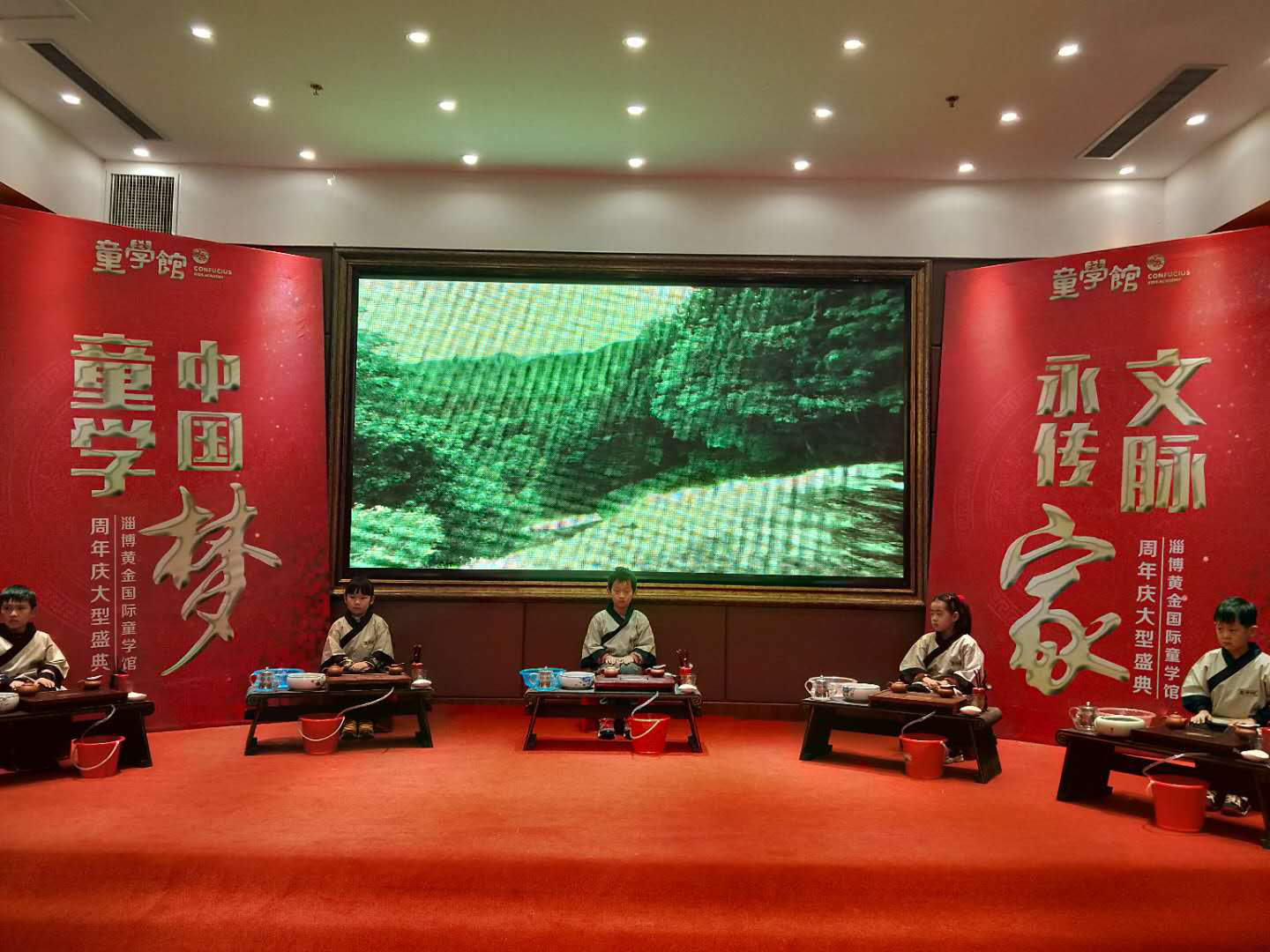 一開場,童學(xué)館的小弟子們?yōu)榇蠹規(guī)硪粓鰞?yōu)雅的《快樂養(yǎng)心茶道》。琴韻、清泉、茶香,怡人心脾。接著全體嘉賓、老師、家長和孩子,共同舉行了盛大的拜孔禮,表達(dá)對至圣先師的尊祟、對求知與師道的敬仰。