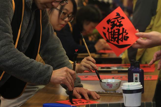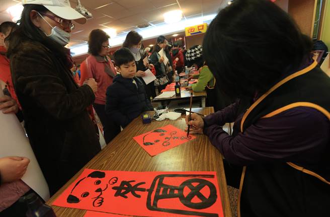 臺(tái)中市萬(wàn)和宮10日舉行「迎春納福寫(xiě)春聯(lián)送春聯(lián)活動(dòng)」除傳統(tǒng)寫(xiě)法,也有結(jié)合圖畫(huà)的創(chuàng)意春聯(lián)。(黃國(guó)峰攝)