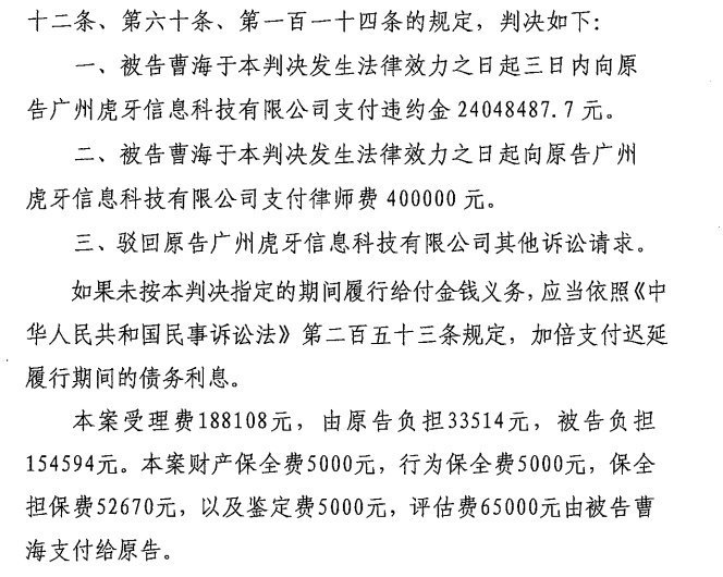 被告曹海于判決發(fā)生法律效力之日起三日內向原告廣州虎牙信息科技有限公司支付違約金24048487.7元及律師費40萬元。