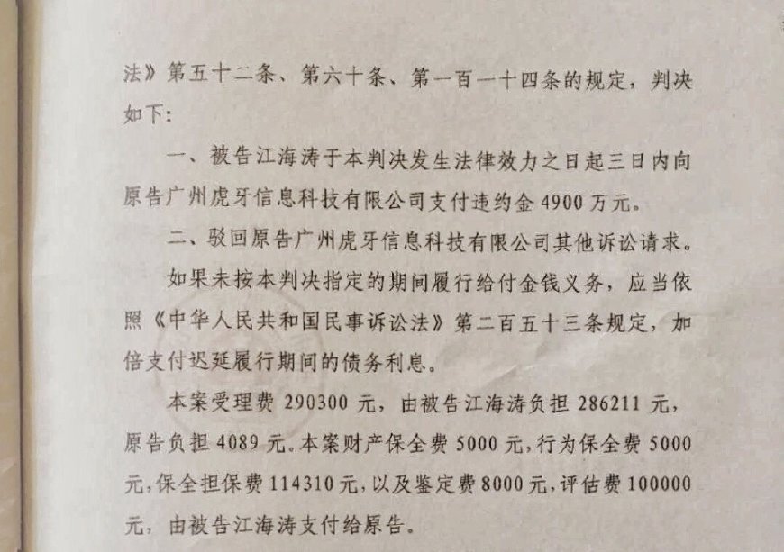 被告(江海濤)需要在判決生效三日起,支付虎牙違約金4900萬元。此外虎牙表示對于違約侵權的主播,將通過法律追責到底。