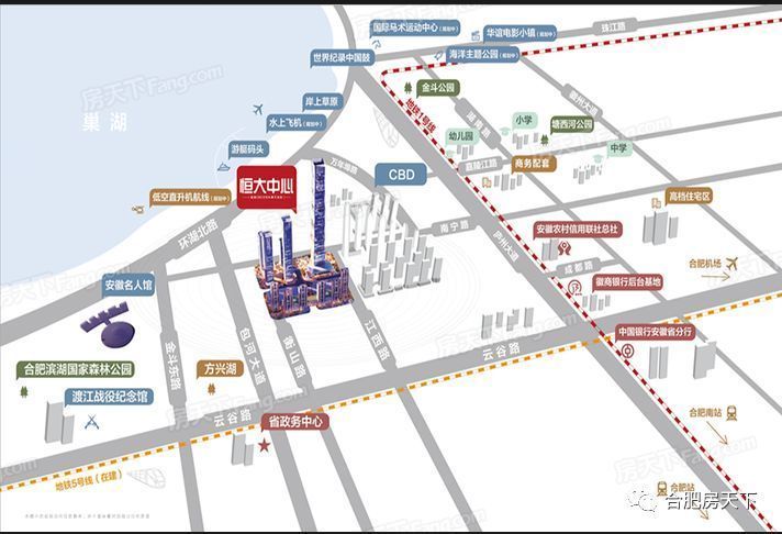 恒大中心位于濱湖新區(qū)灣區(qū)CBD核心區(qū)南寧路與江西路交匯處,距安徽省政府約3公里,是由世界500強(qiáng)中國恒大集團(tuán)斥資165億打造的一座集商業(yè)、辦公、酒店、觀光、居住等功能于一體,最具國際水平的地標(biāo)性建筑及超大型城市綜合體。占地面積13萬方,總建面115萬方,其中包含一座518米的超高層主塔和四座建筑高度99-298米依次遞增布置的副塔,共同構(gòu)筑一線環(huán)湖摩天商務(wù)集群,全面代言合肥商務(wù)發(fā)展的世界高度。