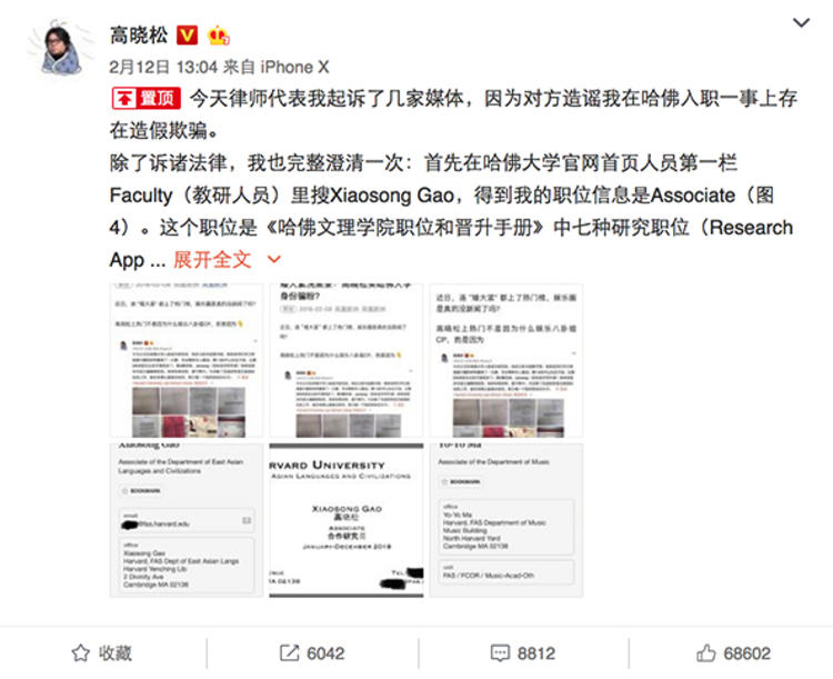 高曉松辟謠起訴媒體。近日,有媒體報道稱,高曉松在哈佛入職一事上存在造假欺騙,稱其 “買哈佛大學(xué)身份騙粉” ,2 月 12 日,高曉松于微博辟謠稱,“作為公眾人物,被監(jiān)督、質(zhì)疑是理所應(yīng)當(dāng)?shù)模踔帘慌u、嘲諷也有必要的容忍義務(wù),但是,法律是底線。”并表示已經(jīng)起訴了這幾家媒體。
