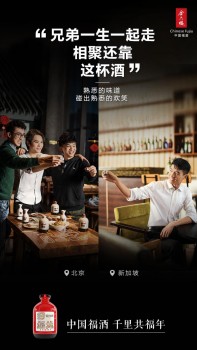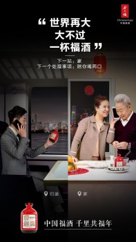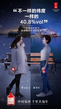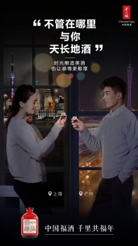 除了引爆朋友圈的《千里共福年》H5,金六福還發(fā)布了一組“千里共福年”系列海報(bào)。海報(bào)分為親子篇、戀人篇、兄弟篇和閨蜜篇,囊括了現(xiàn)代年輕人以情感為連接的人際關(guān)系類(lèi)型。海報(bào)通過(guò)創(chuàng)意拼接的方式,將身處不同地點(diǎn)的關(guān)系雙方,通過(guò)同飲一杯金六福福酒的契機(jī),聯(lián)系在了一起。該系列海報(bào)上有配合場(chǎng)景的描述文案,如“不一樣的緯度,一樣的40.8%vol”“世界再大,大不過(guò)一杯福酒”,引起了眾多目標(biāo)受眾的共鳴。同時(shí),“中國(guó)福酒·千里共福年”的主題得以再一次呈現(xiàn),增加了消費(fèi)者對(duì)金六福春節(jié)營(yíng)銷(xiāo)主題的印象。