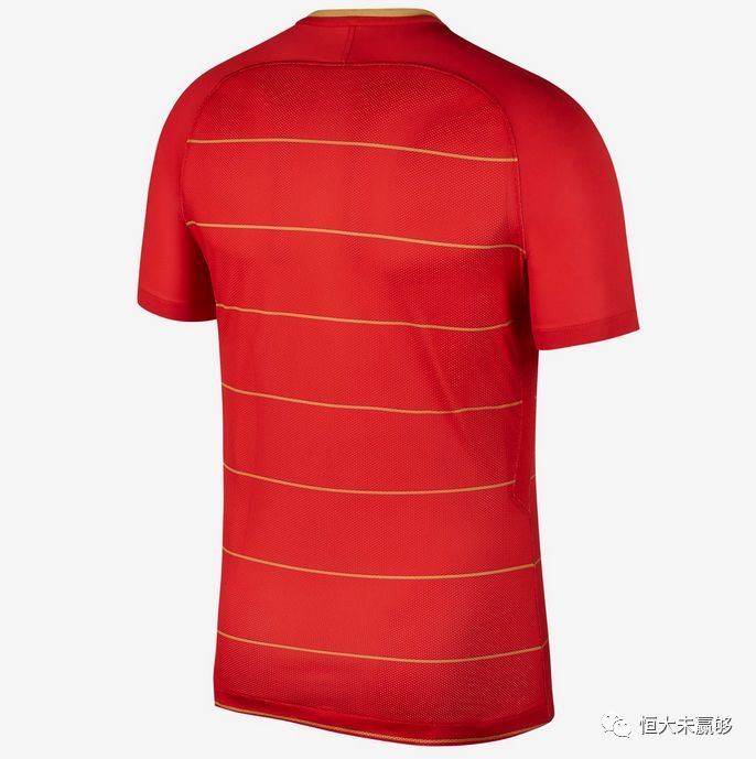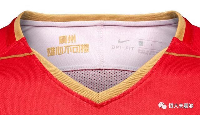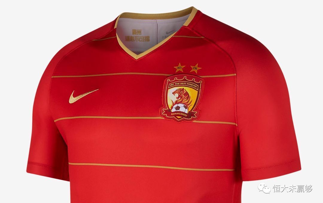 恒大新賽季球衣依然是紅金搭配,球衣主體部分是七條金色的細(xì)橫線。