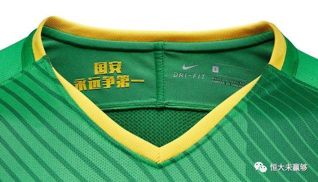 國(guó)安新賽季球衣繼續(xù)以黃邊來(lái)裝飾綠色,球衣主體部分是斜線紋,與前幾個(gè)賽季相比,國(guó)安的球衣沒(méi)有太多變化。