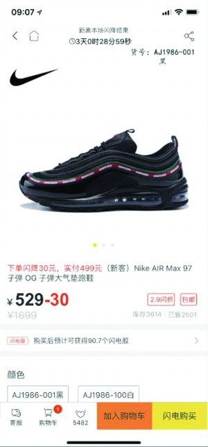2月12日,記者接到了來自張先生的投訴稱,一個名為“閃電降價”的電商平臺近期頻繁在微博、今日頭條、騰訊視頻、UC和抖音等熱門社交或媒體平臺推廣折扣商品,于是嘗試在該平臺上購物,買了一雙市價數(shù)千元的聯(lián)名款耐克鞋Undefeated×Nike Air Max 97,平臺上顯示的“新客專享價”僅為499元。據(jù)了解,Undefeated×Nike Air Max 97系列于2017年9月發(fā)售,發(fā)售價為180美元,約為1135元人民幣。目前,該鞋款的代購市場價為4000元人民幣,以此計算,閃電降價平臺的價格相當(dāng)于市場價的1折左右。