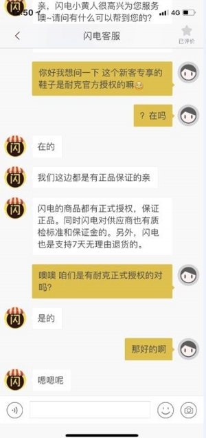 對于張先生的鞋款“是否是正品”疑問,記者從閃電降價客服人員處得知,“平臺所售商品都是正品”。當(dāng)記者詢問上述鞋子是否是耐克官方授權(quán)時,客服人員給予了肯定的答復(fù)。