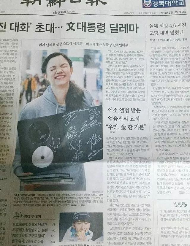 這次來參加平昌冬奧會(huì),當(dāng)記者在機(jī)場(chǎng)送上由EXO成員親手寫下應(yīng)援信息的簽名專輯時(shí),少女心炸裂的梅娃不禁尖叫:“這是在做夢(mèng)嗎?感覺就像拿到了金牌一樣!”這則報(bào)道還登上了當(dāng)?shù)貓?bào)紙的頭版頭條。