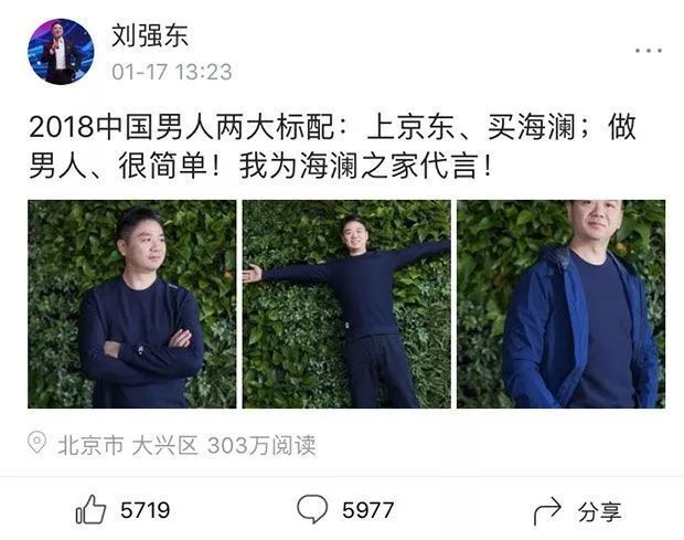 但海瀾之家“倒戈”騰訊也并非沒(méi)有預(yù)兆。今年 1 月份,劉強(qiáng)東在今日頭條微頭條中更新了一條狀態(tài)就曾引發(fā)熱議,他寫(xiě)道:“2018 中國(guó)男人兩大標(biāo)配:上京東、買(mǎi)海瀾;做男人、很簡(jiǎn)單!我為海瀾之家代言!”很快,海瀾之家就與京東打得火熱,1 月 23 日,雙方聯(lián)合舉辦了“超級(jí)品牌日”。