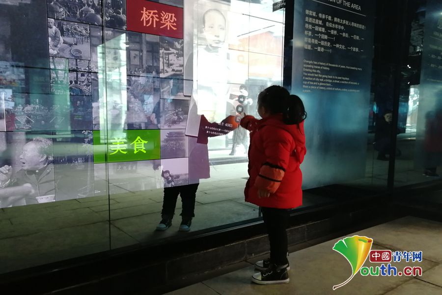 在“水韻天府”里的展館里,記者看到很多小朋友都在名為錦城尋跡長(zhǎng)廊玩得意猶未盡。長(zhǎng)廊兩邊的墻面屏幕上有著很多成都老照片,這些照片可以放大,可以點(diǎn)贊,還可以下載,每張照片下面都有介紹,可以了解到照片背后的故事。