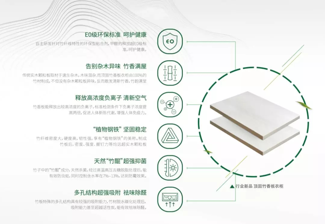 以竹筑所,竹盛清茶,枕夢竹席,竹織籬笆,將竹融入家居生活,是品質(zhì)更是品味之選。頂固革新研發(fā)推廣的竹香板用以下難以替代的優(yōu)點,奠基高端品質(zhì)家居。