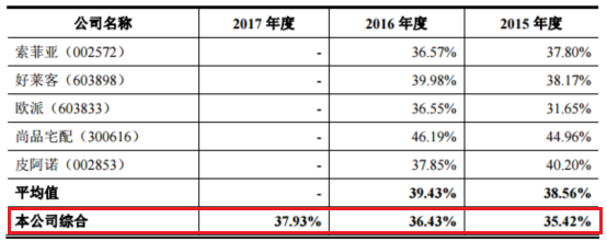 招股書顯示,頂固集創(chuàng)的綜合毛利率均低于選取的同行業(yè)上市公司毛利率平均值。2015-2017年,頂固集創(chuàng)的綜合毛利率分別為 35.42%、36.43%、37.93%;同行平均值為38.56%、39.43%。