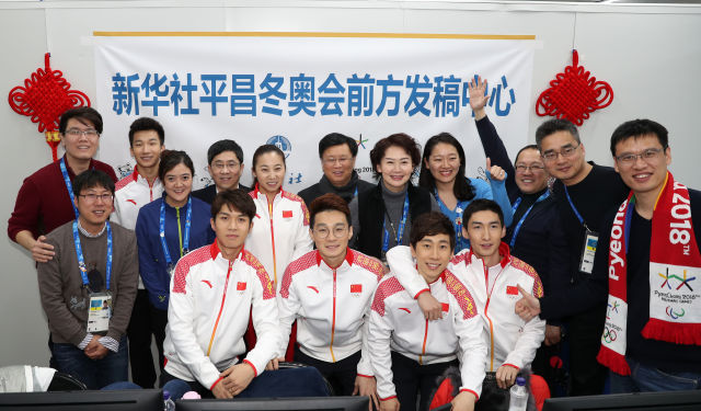 ↑李琰(左七)、中國(guó)短道速滑隊(duì)部分隊(duì)員與新華社記者在新華社平昌冬奧會(huì)前方發(fā)稿中心合影。新華社記者李鋼攝