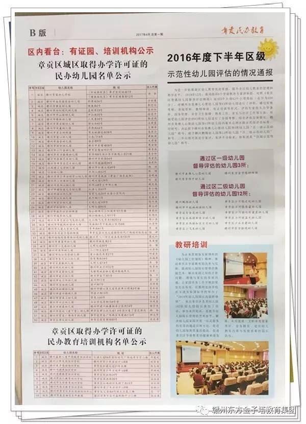 為進一步拓展章貢區(qū)幼兒教育優(yōu)質(zhì)資源,提升全區(qū)幼兒教育的管理和教學(xué)水平,2016年12月,章貢區(qū)教育局組織8個學(xué)前教育專家評審組,對照《章貢區(qū)普通幼兒園督導(dǎo)評估細(xì)則》對應(yīng)5個大項42個小項指標(biāo)(總分為400分),對贛州市章貢區(qū)83所幼兒園進行了評估,綜合評估總體情況,贛州東方金子塔幼稚園等15所幼兒園均達(dá)到區(qū)級示范園評估標(biāo)準(zhǔn),經(jīng)研究,決定授予贛州東方金子塔幼稚園等3所幼兒園“區(qū)一級示范幼兒園”稱號。