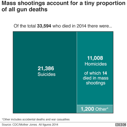 2014年,美國因槍致死的33594人中,有21386人為自殺,11008人為他殺,其中14人死于大規(guī)模槍擊事件,另有1200人死于其他原因。