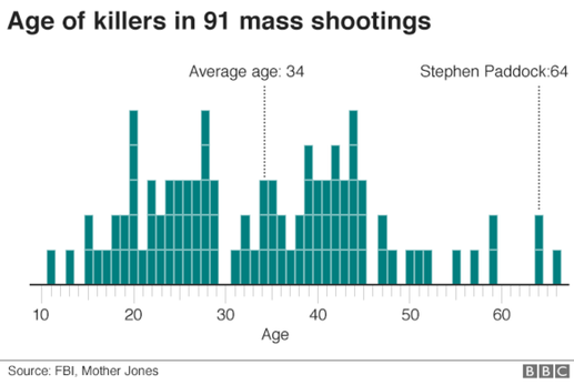 在美國已記錄的91起大規(guī)模槍擊案中,兇手的平均年齡僅為34歲。拉斯維加斯槍擊案的兇手史蒂芬·帕多克是這些兇手中僅有的3名年逾60歲者之一。這些兇手中年紀(jì)最小的是安德魯·道格拉斯·戈?duì)柕恰?998年,年僅11歲的戈?duì)柕欠鼡袅税⒖仙菀凰袑W(xué)的師生,和當(dāng)年僅13歲的米切爾·斯科特·約翰遜共同造成5人死亡、10人受傷。