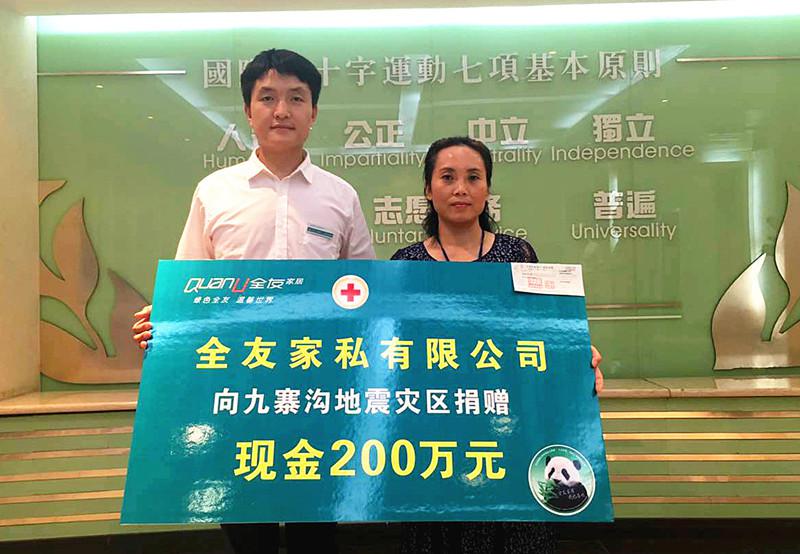 2017年8月,四川阿壩州九寨溝縣發(fā)生7.0地震,全友家居快速響應(yīng),緊急開展捐款行動(dòng),將凝聚著十萬全友人深情厚誼的200萬元捐款送往省紅十字會(huì)。據(jù)統(tǒng)計(jì),全友家居先后為汶川地震災(zāi)區(qū)、玉樹地震災(zāi)區(qū)、云南彝良地震災(zāi)區(qū)、雅安廬山地震災(zāi)區(qū)、甘肅定西地震災(zāi)區(qū)、魯?shù)榈卣馂?zāi)區(qū)捐款捐物,捐助了近2000萬元的現(xiàn)金和物資。