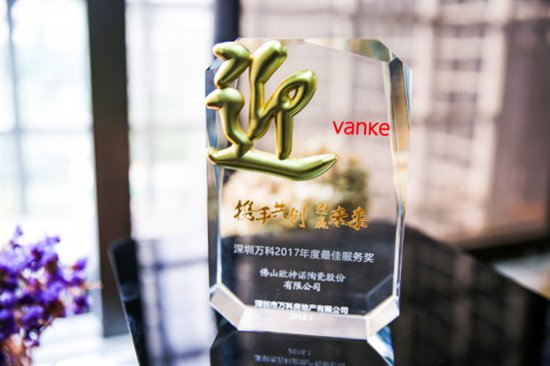 “攜手共創(chuàng),迎贏未來”,1月23日,深圳萬科2018年度供方春茗會暨2017年度工程評估總結(jié)會在深圳南山前海萬科企業(yè)公館召開。此次會議上,佛山歐神諾陶瓷有限公司獲得了“深圳萬科2017年度最佳服務(wù)獎”,這是對歐神諾陶瓷作為萬科戰(zhàn)略合作伙伴的積極肯定,同時也是對我們今后對客戶供應(yīng)產(chǎn)品質(zhì)量的高度又提升了一個層次。歐神諾陶瓷萬科項目總監(jiān)曾志釗先生作為代表,接受了該獎項,這也是深圳萬科瓷磚類供應(yīng)商唯一獲得嘉獎的單位。