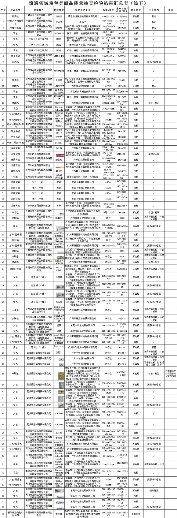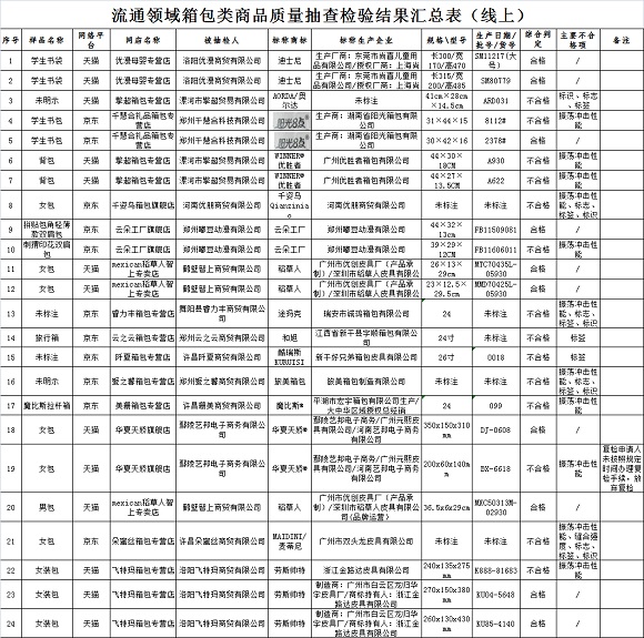 中國質量新聞網訊 2018年2月24日,河南省工商行政管理局官網公示2017年度流通領域箱包類商品質量抽查檢驗結果信息,KELME、8848?、迪士尼、卡拉羊、卡拉拜特?、凱智麗、monALISA蒙娜麗莎、勞恩斯?LAOENSI、SWISSGEAR、七匹狼、依諾鑫格?YINUOXINGE、袋鼠、Freeouter、意爾康、Marino Orlandi馬連奴、MEXICAN稻草人、AORDA/奧爾達、WINNER?優(yōu)勝者、千姿鳥Qianziniao、云朵工廠、途瑪克、和旭、酷瑞斯KURUISI、旅美箱包、魔比斯?、MAIDINI/麥蒂尼、勞斯帥特等標稱商標商品被檢出不合格。不合格項目涉及標簽、標識、振蕩沖擊性能、色牢度、縫合強度等。