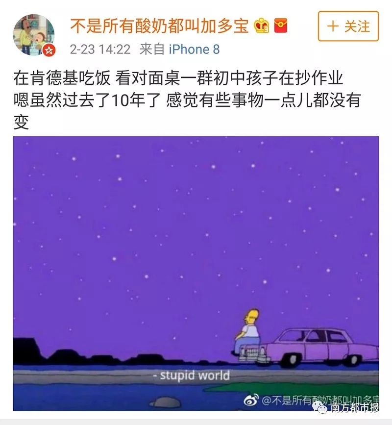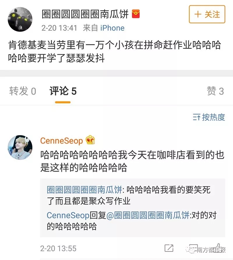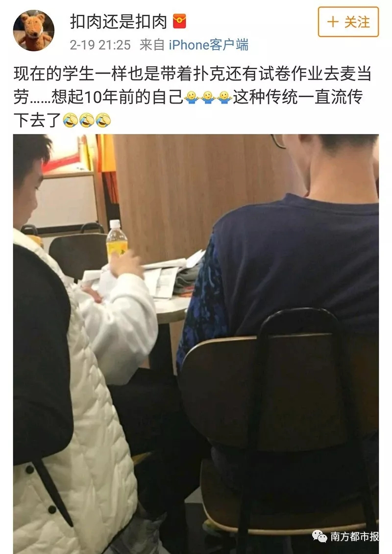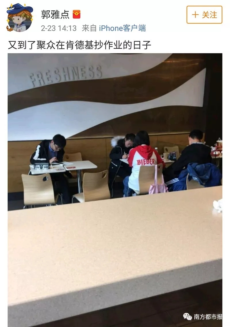 春節(jié)長(zhǎng)假結(jié)束,家長(zhǎng)們上班了,只好讓娃(一般是小學(xué)高年級(jí)和初高中生)自己獨(dú)立在家完成作業(yè)。于是離家比較近的便利店、圖書館、肯德基、星巴克和書店就成了娃們趕作業(yè)的最佳場(chǎng)所。