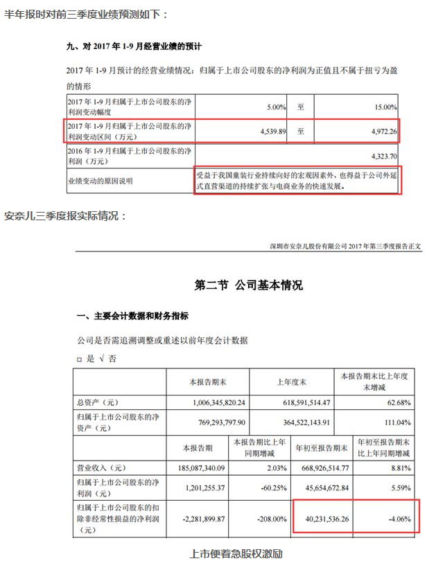 10月底,安奈兒拋出股權激勵計劃,到了12月中旬,才完成股權激勵首次授予登記工作。而其三季度報告,恰好在10月底出來。