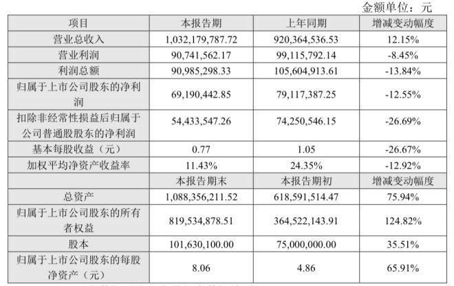 期內(nèi),實(shí)現(xiàn)營(yíng)收總額10.32億元,同比增長(zhǎng)12.15%;營(yíng)業(yè)利潤(rùn)為0.91億元,同比下滑8.45%。歸屬于上市公司股東的凈利潤(rùn)下降12.55%至0.69億元。