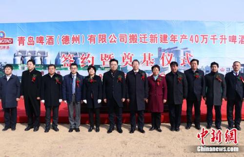 中新網(wǎng)2月11日電 2月9日,青島啤酒(德州)有限公司年產(chǎn)40萬千升啤酒項目簽約暨奠基儀式,在德州市平原縣舉行。德州市委副書記、市長陳飛,副市長馬俊昀,平原縣委書記王洪霞、縣長袁志勇,青島啤酒公司副總裁王瑞永,總裁助理、戰(zhàn)略投資管理總部部長王少波,營銷總裁助理、山東省區(qū)總經(jīng)理燕爭光,青島啤酒(德州)有限公司總經(jīng)理趙吉敏等領(lǐng)導(dǎo)出席儀式。