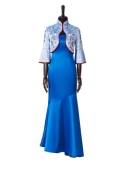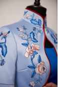 志愿者禮儀服,采用旗袍立領(lǐng)及包邊工藝,領(lǐng)口前襟應(yīng)用溫柔的水波紋設(shè)計(jì),領(lǐng)口以源于木雕上的牡丹紋樣刺繡妝點(diǎn),微喇的袖口設(shè)計(jì)與裙擺處微波蕩漾的剪裁呼應(yīng),映襯禮儀小姐端莊婀娜的步態(tài),以溫婉謙和之姿表達(dá)互聯(lián)網(wǎng)賦予世界的共振。