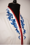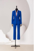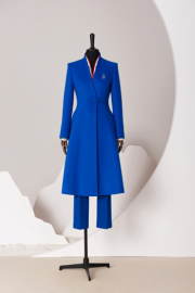女志愿者套裝,外套采用了漢服青果領(lǐng)設(shè)計(jì),輔以深色的鑲邊工藝;搭配的襯衣于領(lǐng)襟與袖口處同樣沿用了鑲邊工藝,頗具古典韻味的綰紅與藍(lán)色外套形成撞色效果,并與環(huán)繞門襟及袖口的牡丹紋理相映成趣,令整身行頭神采奕奕又不失精雅秀致。