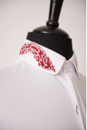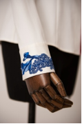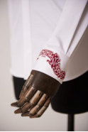 男志愿者套裝,同樣由襯衫西褲西裝組成,橋元素滲透于服裝的每一個細(xì)節(jié),領(lǐng)片和袖口將橋廊及橋身處獨(dú)特的圖騰紋樣加以沿用,通過貼繡的方式以綰紅色呈現(xiàn),寓意傳承互聯(lián)與創(chuàng)造。