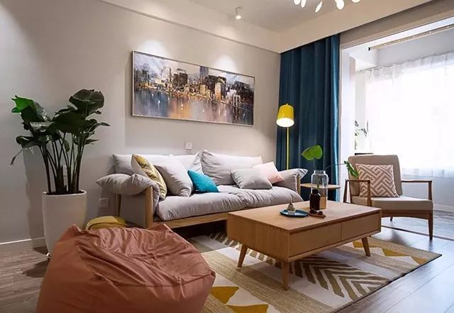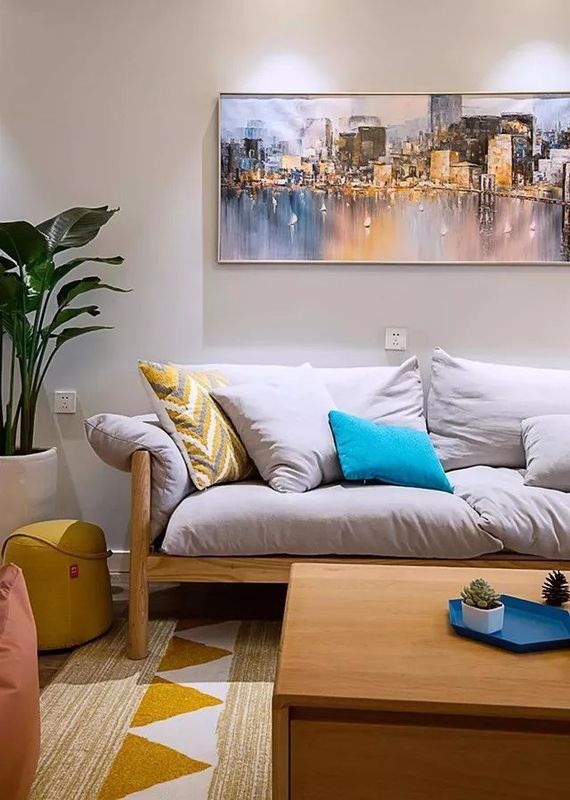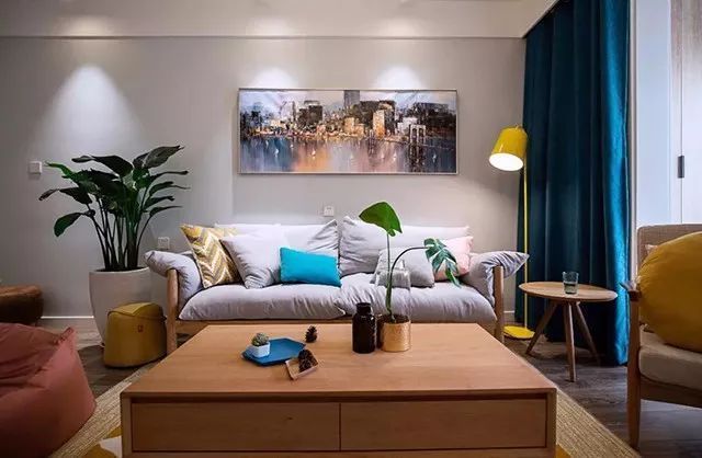整個客廳在木質地板與電視柜、茶幾的基礎,結合上舒適自然的布藝沙發,再點綴上鮮艷的抱枕、清新的綠植,整個空間都呈現出一個簡潔自然的空間感;