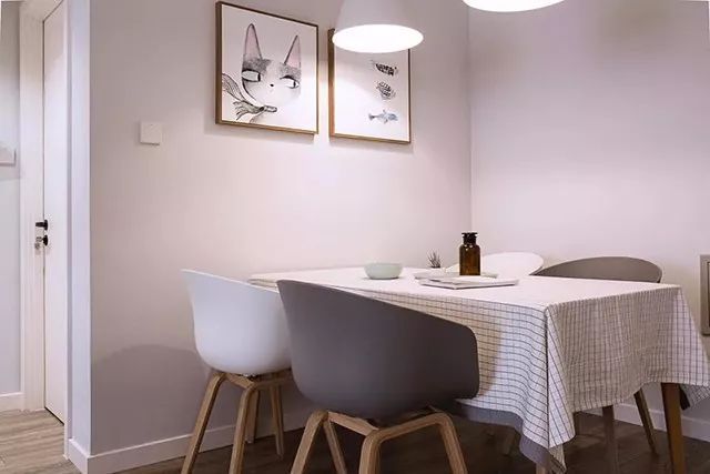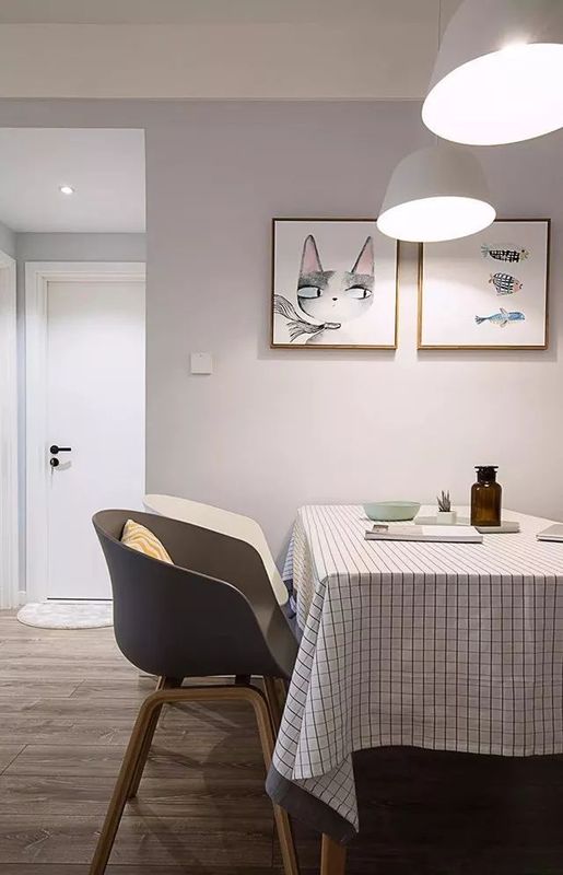 餐廳背景墻上掛上貓咪與小魚的裝飾畫,搭配上精致的吊燈,還有清新范的桌布,整體顯得文藝而又精致;
