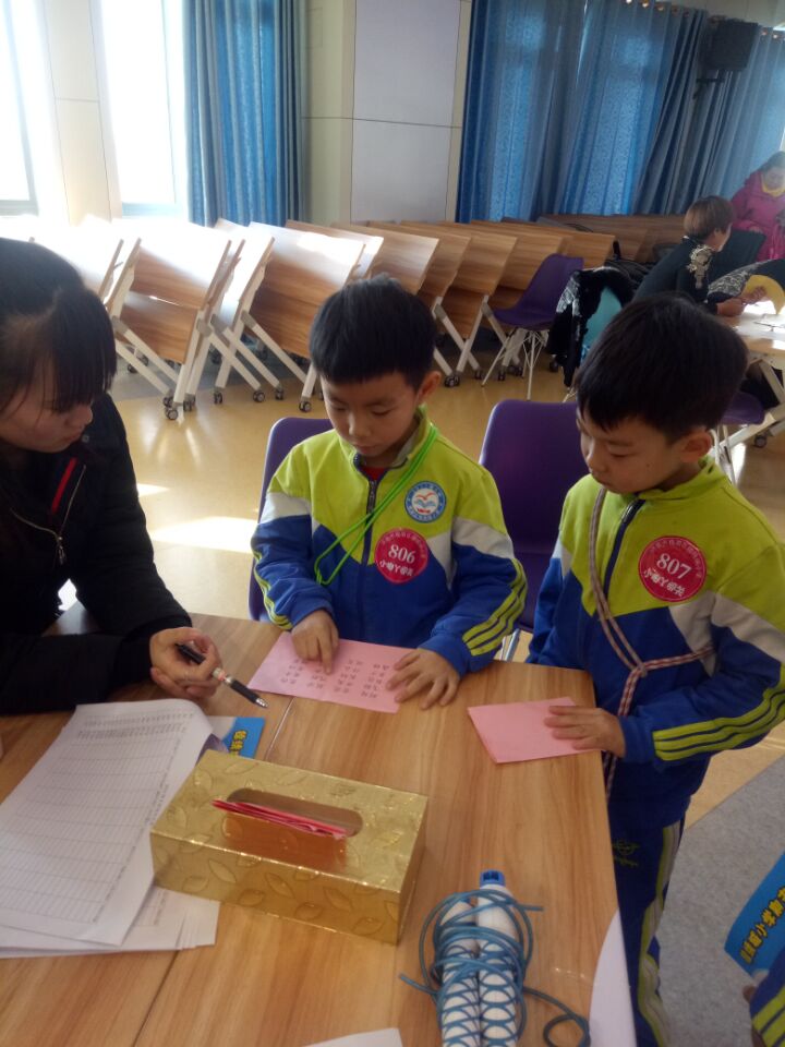 本次闖關(guān)的地點設(shè)在教室、會議室等處,教室門口張貼本考室的闖關(guān)主題海報,校園里彌漫著新鮮、快樂的氣息。本次闖關(guān)活動由專業(yè)教師做考官,家長志愿者進行學生的組織,并協(xié)助考官做好成績的記錄與過關(guān)標志的粘貼,這樣的分工與合作,讓本次活動有序順利地進行。