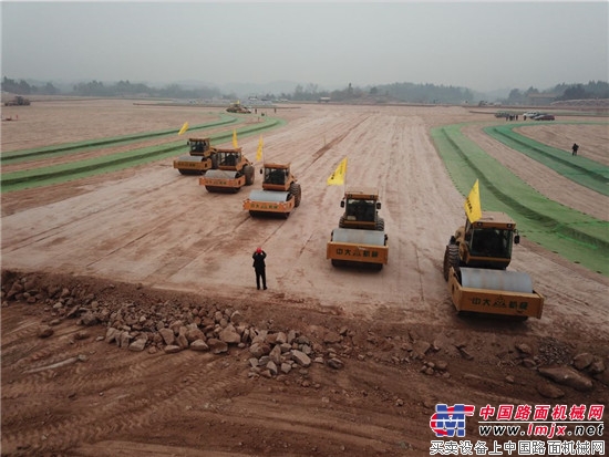 天府機場地基處理及土石方工程建設時期,面臨工期緊,任務重,還要解決高填方不均勻沉降這個世界難題。天府國際機場建設指揮部、中國民航機場建設集團公司、四川中澳建設工程試驗檢測有限責任公司、同濟大學、西南交大、西安西北民航項目管理有限公司、中國電建航空港、陜西中大機械集團臨危受命,聯(lián)合攻關,引入了36噸超大激振力全液壓壓路機,與傳統(tǒng)工法相比,效率提高2到3倍,成本下降1倍多,質(zhì)量更有保證,為打造機場品質(zhì)工程做出突出貢獻。