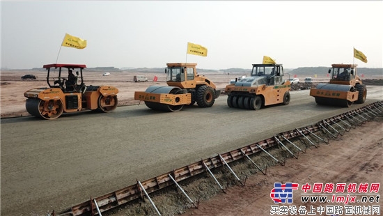 與此同時成都天府國際機場建設指揮部、中國民航機場建設集團、同濟大學機場工程研究中心、四川建安公司、華東監(jiān)理、陜西中大機械集團、德通振動攪拌有限公司等單位在成都天府機場聯(lián)合做了水泥穩(wěn)定層壓實36厘米、40厘米厚實驗,所用設備也是中大機械提供的被稱為“四合一\u00A0鐵搭檔”的“變形金剛”結(jié)構抗離析攤鋪機、YZ36單鋼輪壓路機、YZZT38單鋼輪壓路機、YL37膠輪壓路機、YZC13/17雙鋼輪壓路機。