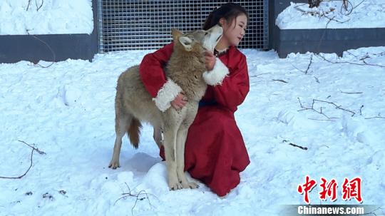 內蒙古美女楊文靜與狼零距離接觸。呂子豪 攝