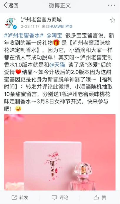 但是,令人沒想到的是,這款香水的“父親”竟然是天貓。據(jù)瀘州老窖電商負(fù)責(zé)人易彬所說,“出香水只是個(gè)無心插柳的跨界嘗試,香水是和‘天貓’談了場戀愛后的‘愛情結(jié)晶’,是兩家共同的孩子”。