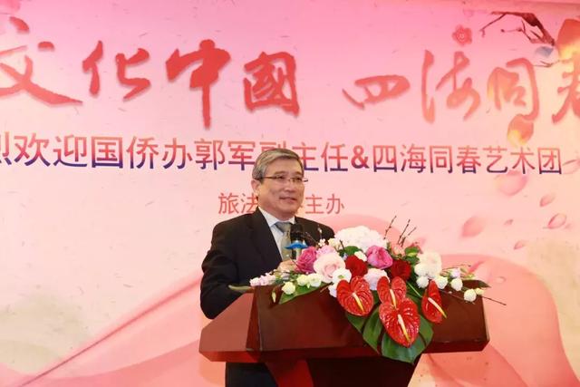 關(guān)鍵公使代表中國(guó)駐法大使館、翟雋大使歡迎遠(yuǎn)道而來的郭軍副主任及代表團(tuán)各位成員、"文化中國(guó)·四海同春"的藝術(shù)家們,并感謝國(guó)務(wù)院僑辦心系僑胞,組織藝術(shù)團(tuán)再次來到巴黎慰?jī)S演出:文化中國(guó)·四海同春'每一次演出都受到廣大僑胞和當(dāng)?shù)赜讶说臒崃覛g迎,這個(gè)品牌已成為祖國(guó)連接僑胞的重要感情紐帶,成了旅法僑胞們翹首期盼的每年一度海外'春晚'。
