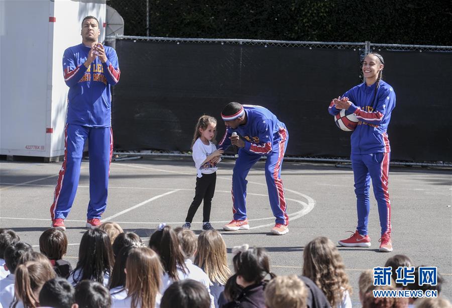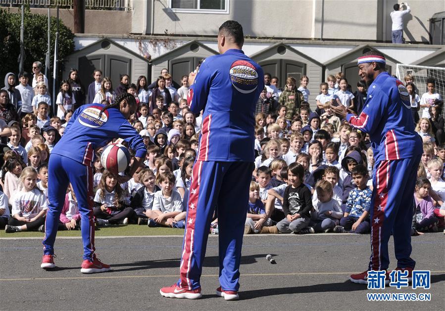 ↑2月21日,哈林籃球隊隊員布萊克斯(中)在洛杉磯一所學校與學生互動。 1926年創(chuàng)立于芝加哥的美國哈林男子籃球隊訪問過100多個國家,他們將出神入化的籃球技術(shù)和幽默詼諧的表演融為一體,被稱為“世界上最受歡迎的籃球隊”。新華社發(fā)(趙漢榮攝)