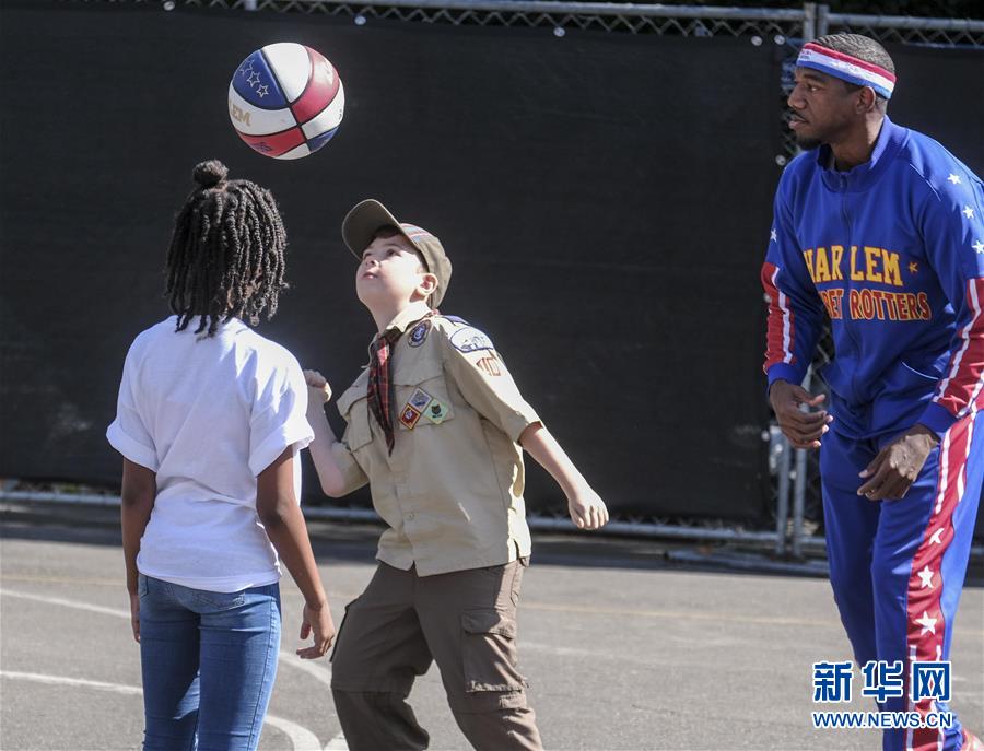 ↑2月21日,哈林籃球隊隊員布萊克斯(右)在洛杉磯一所學校與學生互動。 1926年創(chuàng)立于芝加哥的美國哈林男子籃球隊訪問過100多個國家,他們將出神入化的籃球技術(shù)和幽默詼諧的表演融為一體,被稱為“世界上最受歡迎的籃球隊”。新華社發(fā)(趙漢榮攝)