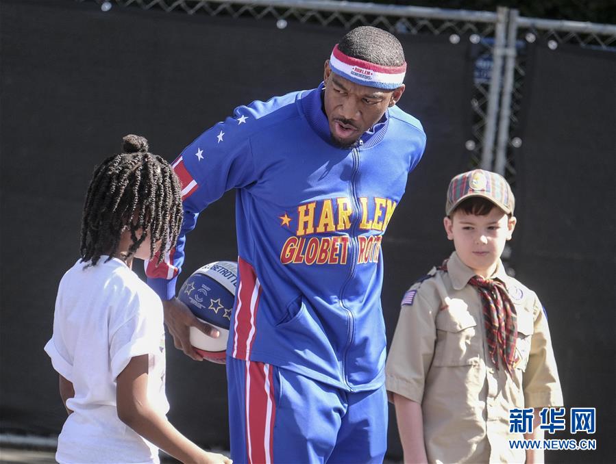 ↑2月21日,哈林籃球隊隊員在洛杉磯一所學校與學生互動。 1926年創(chuàng)立于芝加哥的美國哈林男子籃球隊訪問過100多個國家,他們將出神入化的籃球技術(shù)和幽默詼諧的表演融為一體,被稱為“世界上最受歡迎的籃球隊”。新華社發(fā)(趙漢榮攝)