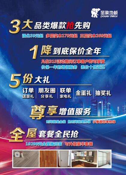 \u00A0\u00A0 微信分享活動到朋友圈,享精美禮品一份。客戶預(yù)定單與銷售人員合影照片+“我已選擇圣象,我為圣象代言”字樣分享朋友圈(靜電拖一個)