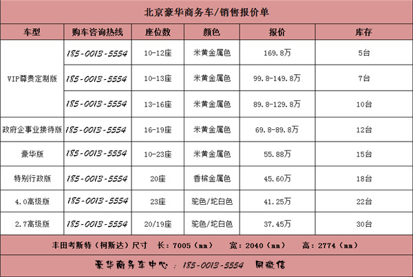 北京廣通集團(tuán)豪華商務(wù)車汽車貿(mào)易有限公司,專業(yè)從事豐田考斯特銷售、裝飾業(yè)務(wù)多年,承接各地政府用車和豪華商務(wù)改裝車,技術(shù)專業(yè),做工精湛,售后服務(wù)周到完善,深受廣大顧客朋友好評(píng)。主要服務(wù)內(nèi)容有豐田考斯特、日產(chǎn)碧蓮、豐田海獅等車型的改裝,現(xiàn)在已能根據(jù)顧客要求改裝各種車型。介紹改裝豐田COASTER 柯斯達(dá) 超VIP至尊高端定制版!