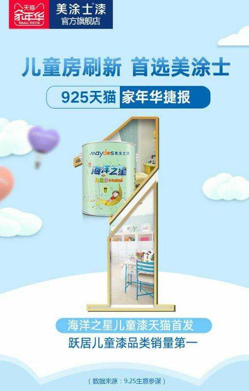 在今年925天貓家年華會(huì)場(chǎng),美涂士?jī)和克⑿峦垦b服務(wù)宣告首發(fā),攜手天貓電商平臺(tái),聚焦兒童房刷新細(xì)分市場(chǎng),打破原有的全屋定制模式,創(chuàng)新性地提出單房刷新,打造一站式兒童房刷新解決方案。美涂士海洋之星兒童房專用刷新套餐同步刷新天貓家年華兒童漆9.25當(dāng)天銷量榜單!