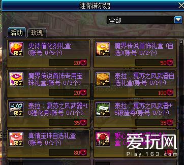 另外一個活動是在推薦地下城收集“玫瑰”給迷你諾爾妮,可以兌換的有武器裝扮禮盒,還有催化劑,這是逼著你做史詩啊?