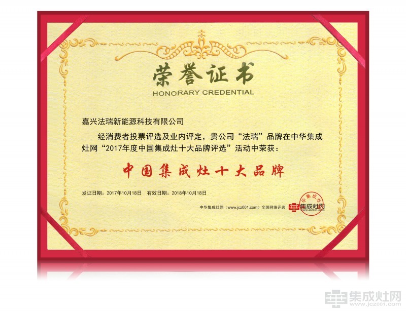 2017年10月18日,由中華集成灶網(wǎng)主辦的2017年度“第八屆中國(guó)集成灶十大品牌”網(wǎng)絡(luò)評(píng)選榜單榮耀揭曉。作為中國(guó)集成灶行業(yè)的領(lǐng)先品牌,法瑞集成灶憑借強(qiáng)大的綜合實(shí)力,榮獲“中國(guó)集成灶十大品牌”稱(chēng)號(hào)。法瑞獲此殊榮,我們向廠家表示祝賀!