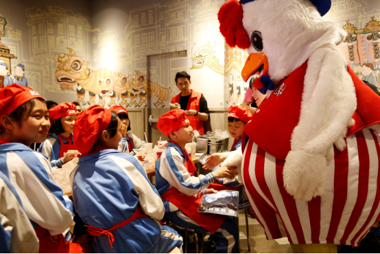 一群來自清遠(yuǎn)市清新縣大巖小學(xué)的30名留守兒童,作為組委會(huì)邀請的特別客人,來觀看廟會(huì)民俗文化巡演,感受廟會(huì)的喜慶歡樂氛圍。逛過了廟會(huì)后,他們來到了光明廣場的肯德基。肯德基的姐姐們帶著孩子們玩起了互動(dòng)小游戲、DIY漢堡……歡樂的時(shí)光總是過得很快,吉祥物奇奇向小客人們贈(zèng)送了兒童玩具和童書,送上了美好的祝愿。