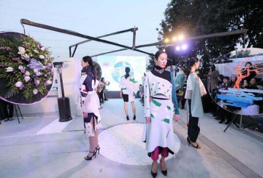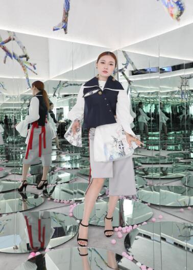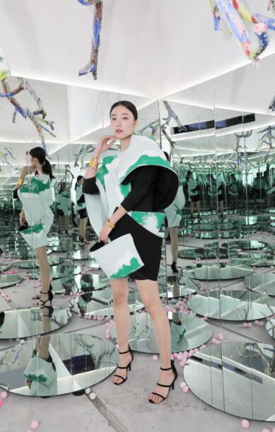 模特在藝術(shù)家現(xiàn)場即興創(chuàng)作“鏡面藝術(shù)”作品前走秀