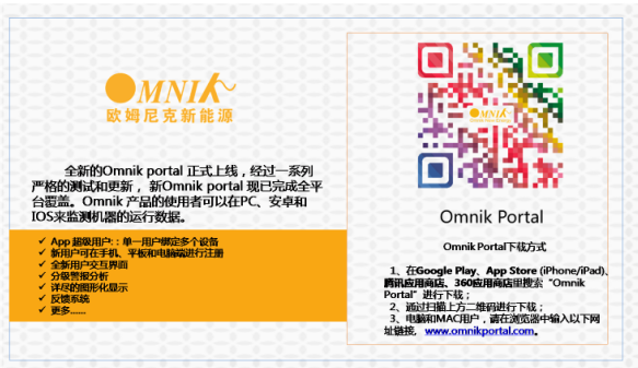 據(jù)悉,歐姆尼克還將同期發(fā)布全新的監(jiān)控平臺Omnik Portal。Omnik Portal的發(fā)布,讓用戶可以通過包括PC、iPhone、Android、iPad、Tablet的多屏實時監(jiān)控電站運行狀況和查詢歷史數(shù)據(jù),能夠更加方便快捷的監(jiān)測電站情況,及時發(fā)現(xiàn)問題,解決問題。從而,成為一個發(fā)電在地面、數(shù)據(jù)在云端的線上線下貫通體驗。
