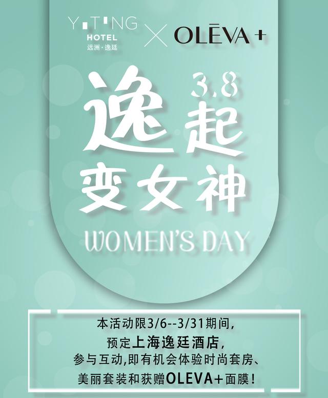 2、3月8日至3月11日,預(yù)定上海逸廷酒店,入住女生有機(jī)會(huì)獲得“OLEVA+法國黃金泥煥顏面膜一份”;